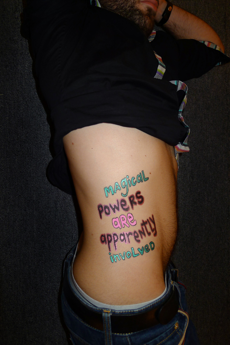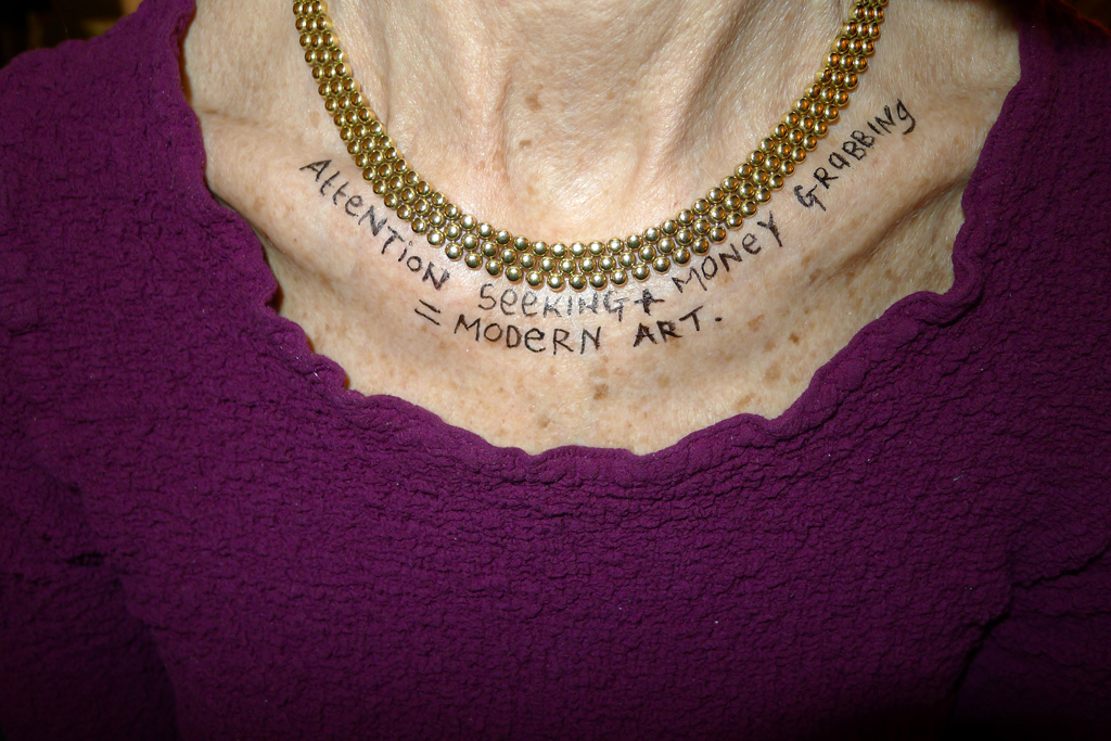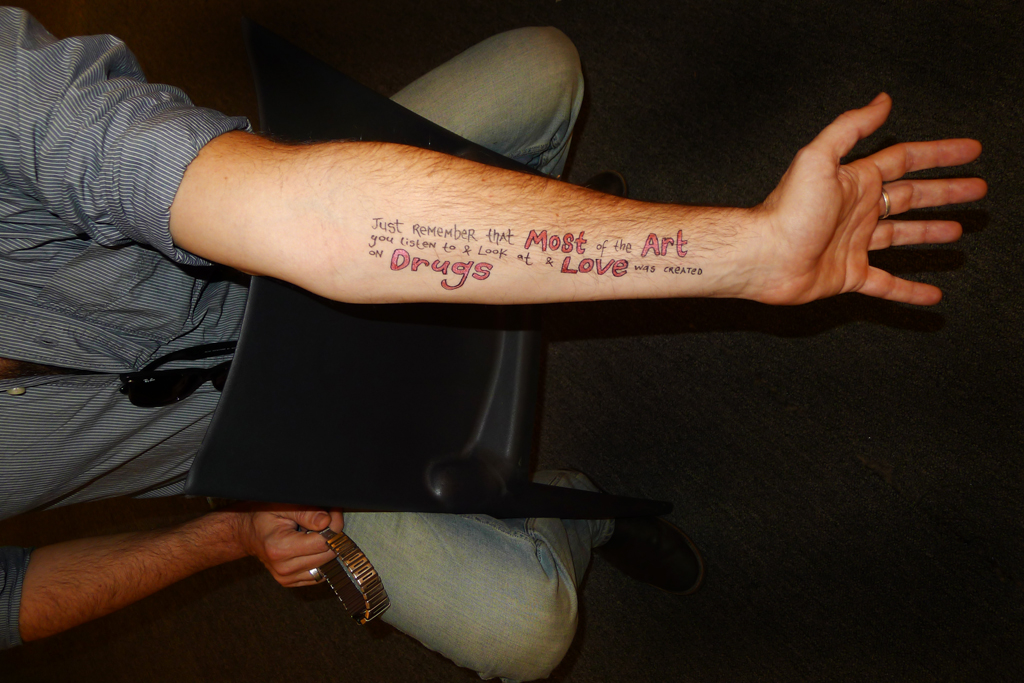 Agent provocateurs were traditionally “secret agents” employed to lure suspects into committing a crime with evidence. In this context the visitor is transformed into an agent provocateur for a night – a ‘durational work’ questioning the merits, ethics and parameters of contemporary art. The tattoos become both a fashion accessory – with Stellmach tattooing to complement “the evening’s antics and outfit” – as well as a positive transformation of the author’s initial, often highly-charged sentiment. People of all ages queued to have their own temporary text-based tattoo, which lasted between one to three days.