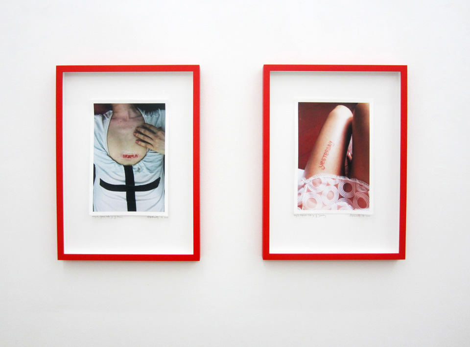 InstallView-Wagner2013 ← Previous Next → Installation view, Day 1, Yasha lets go of Drama and Day 3, Natascha lets go of Yesterday, both inkless tattoos by the artist, ink on hosho paper, 35 x 24cm at Wagner+Partner Berlin, 2013