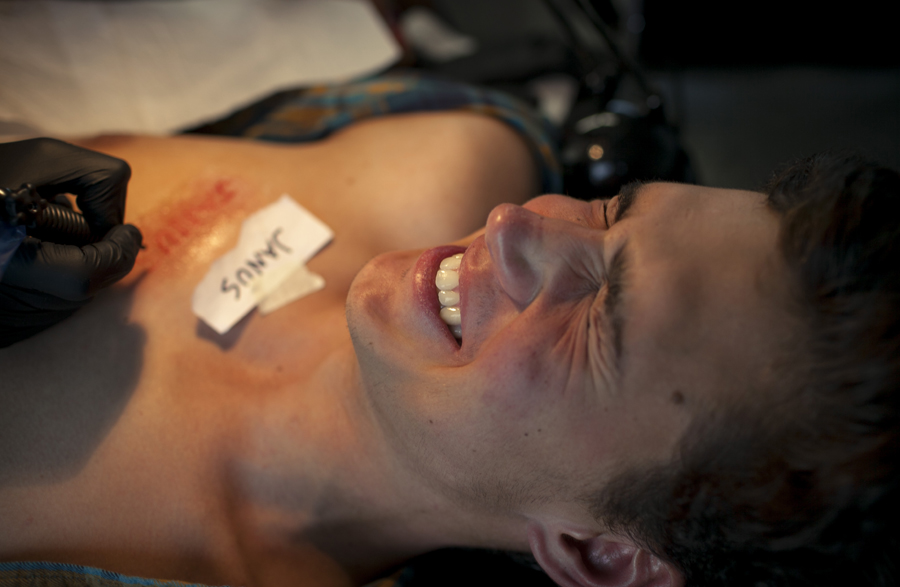 A participant during tattooing, The Letting Go, Berlin Festival, photo by Irma Cirikovic