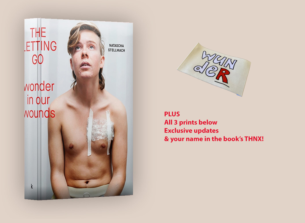 * Your name listed in the book’s acknowledgements as a VISIONARY SUPPORTER (name, i,e: The Love Family, confirmed with you before we go to print, anonymous listings are also possible). * The first to receive the “Limited Edition” goodies listed above (book and Wunder badge). * Three limited edition prints (not just one): “Self Portrait 2014 to 2017” which I performed on myself, as signed, A5 archival prints. * Exclusive updates and invitations. * Donate more and be in the running for AMBASSADOR status: the highest donation! Additionally receive an A2 print of your choice (of all the Letting Go motifs). * Shipping to wherever you are (you’ll receive the Wunder badge asap, the book and prints will take a bit longer. * Price is in Au$ (all other currencies may fluctuate).