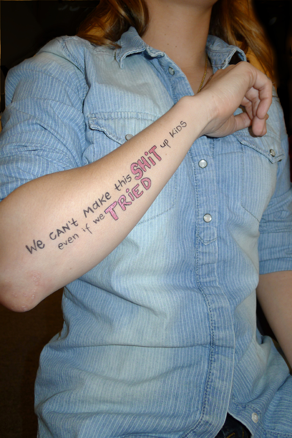 These brash and humerous text-based pen tattoos not only encourage an accessible dialogue around art and body-image, but are also a direct reflection of our vulnerability and humanity. The tattoos become both a fashion accessory – with Stellmach tattooing to complement “the evening’s antics and outfit” – as well as a positive transformation of the author’s initial, often highly-charged sentiment. In keeping with many of Stellmach’s ephemeral works, these naively scribed, yet bold words are ‘exhibited’ on the skin of participants, to end up in the sheets, the shower or a selfie.