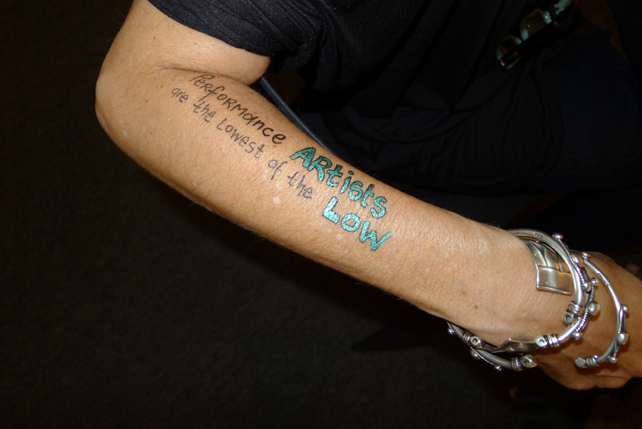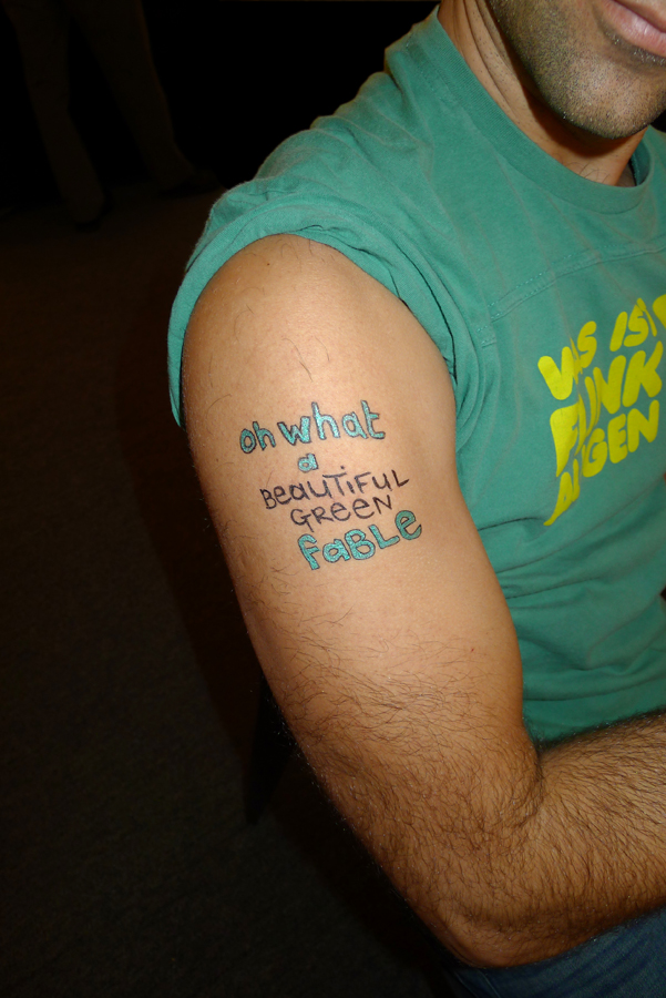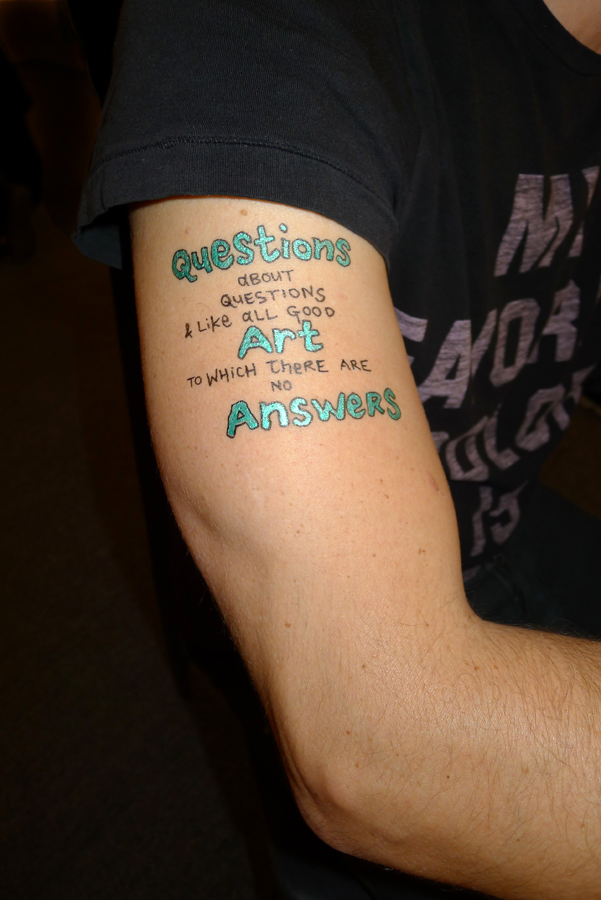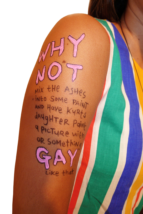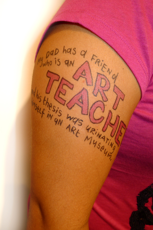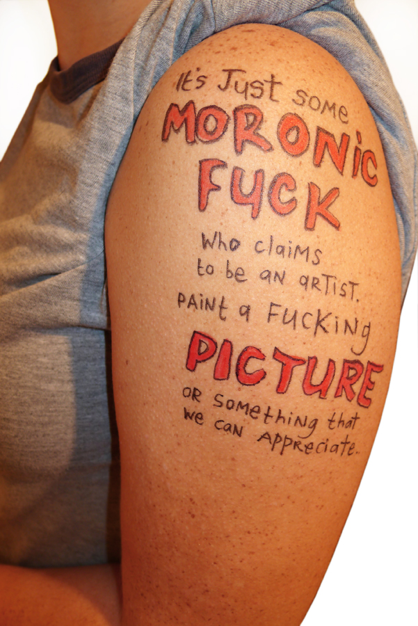 Informed by the controversy around her major project with the ashes of Kurt Cobain, (COMPLETE BURNING AWAY) the “tattooed” statements critique the merits, ethics and parameters of the artist and contemporary art in society. Visitors were invited to choose one of the countless responses to Stellmach’s project, but only from a pool of responses which debated “art”. This was then written onto their skin by the artist.