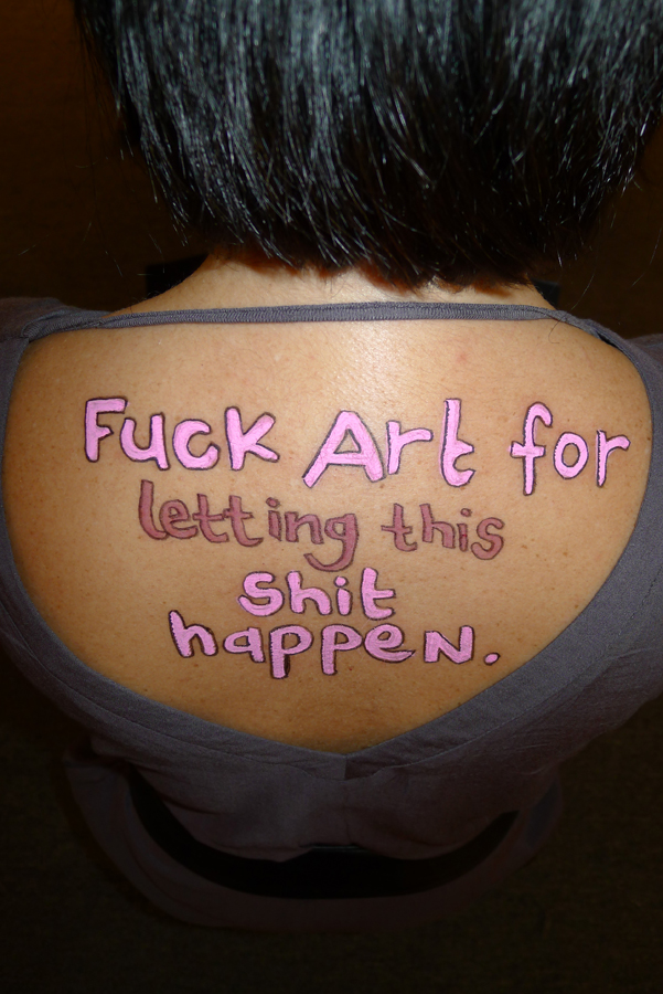 Natascha Stellmach’s 2016 incarnation of her 2011-2012 work, is a performance in which she pens more ‘word plays’ onto bodies, this time working in an anagrammatic manner with the iconic 1980s phrase by the literary subversive, Lawrence Ferlinghetti: ‘Fuck Art Let’s Dance’.