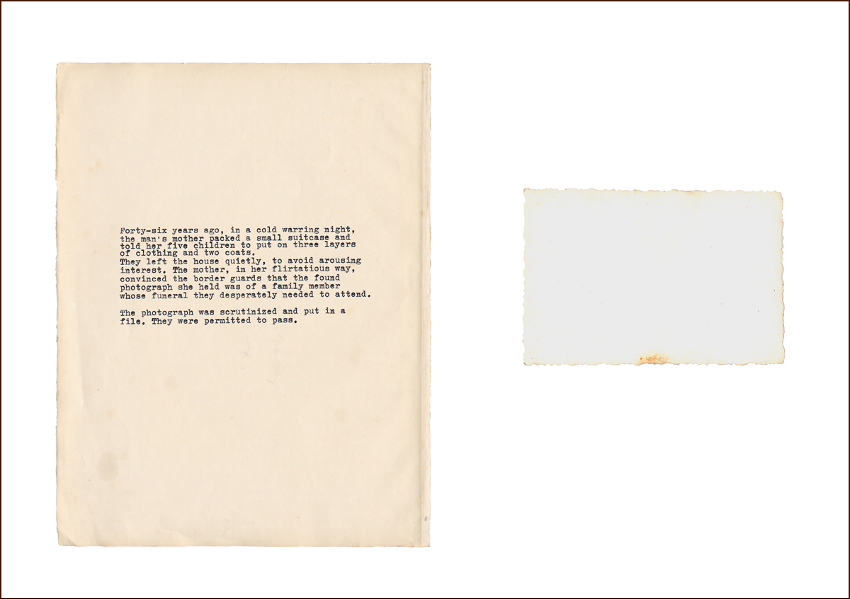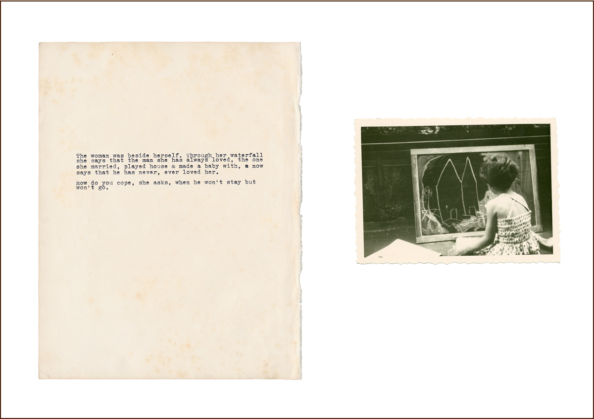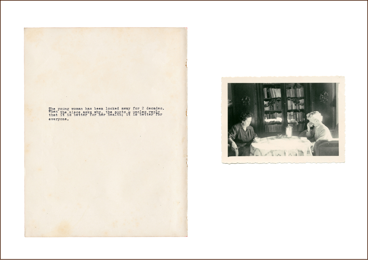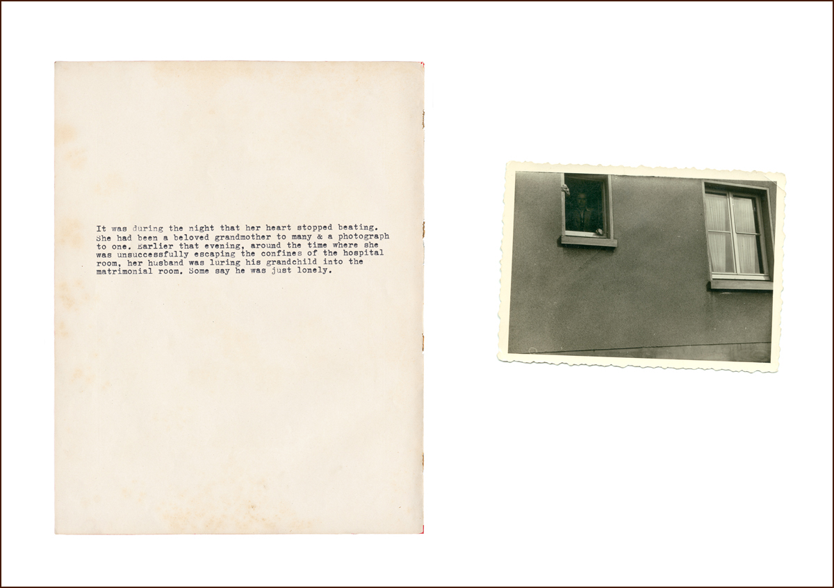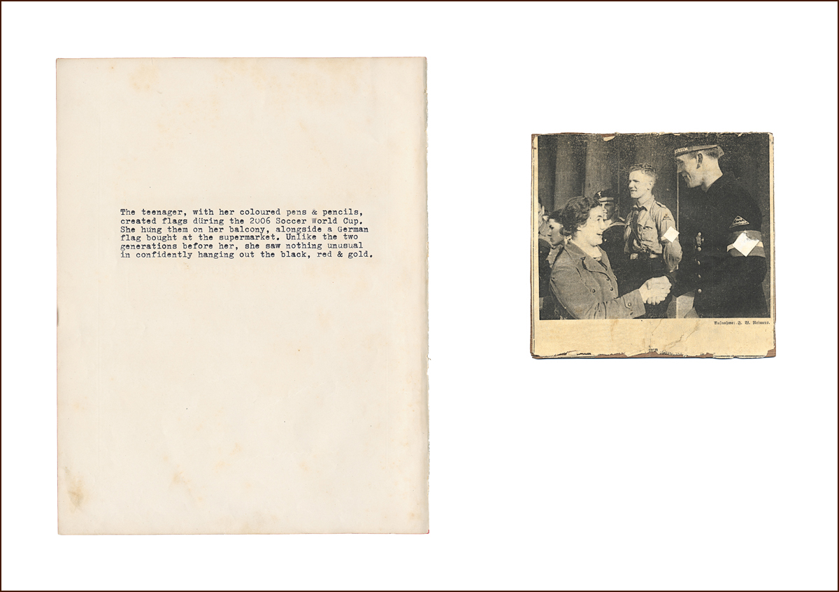 Each of the 11 works are first created as works on paper with antique paper, albums, a typewriter and photographs that were either found or photographed by the artist. These are then cut, burnt or meticulously manipulated. Following this, a scanner (both a ghostly and interrogative light source), gleans the collage to create a singular photo work. These intense narrative collages illustrate the blurring of memory, fact, and fiction often associated with repression and the lasting scars of war and trauma. Their effect is to invite us to investigate our relationship to our own Geschichte (a German word used interchangeably for both ‘history’ and ‘story’).”