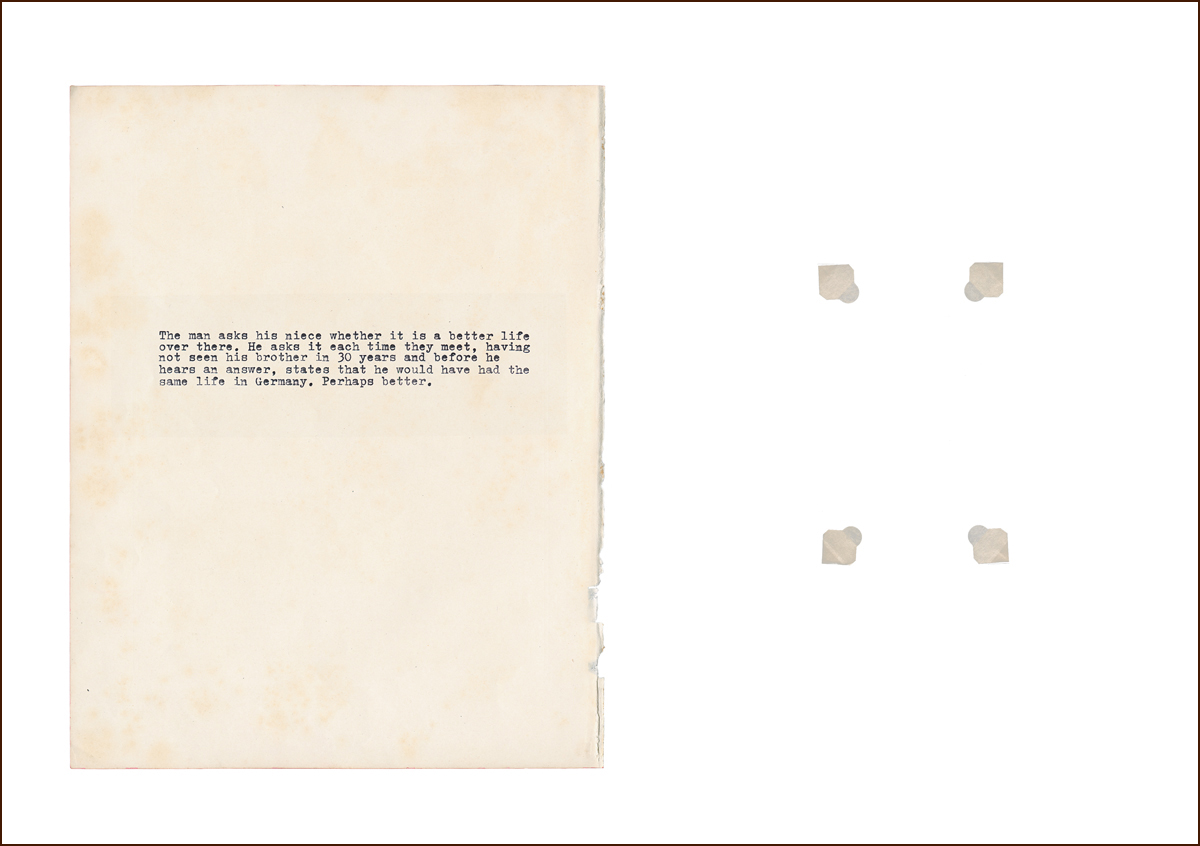 This photographic series and installation narrates a story of displacement, migration and Zerrissenheit (being torn) from the 1940s to the 2000s, set between Germany and Australia. Informed by the prosaic form of the family saga – war, betrayal, murder and reconciliation – BLOOD is inspired by the unspoken aspects of Stellmach’s family story, set against the broader backdrop of German history.