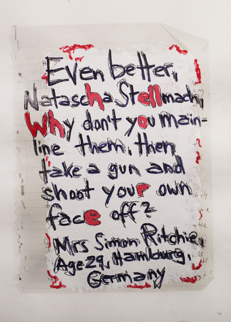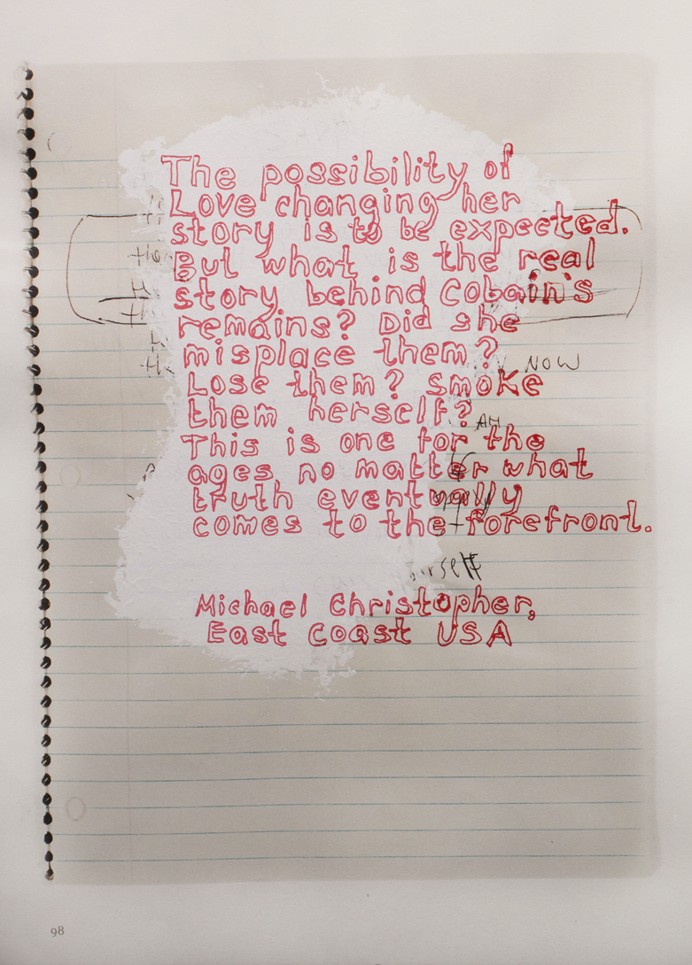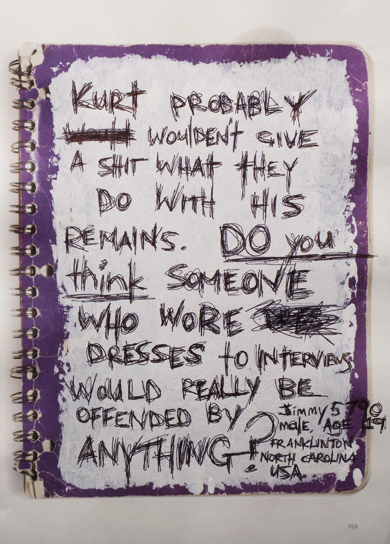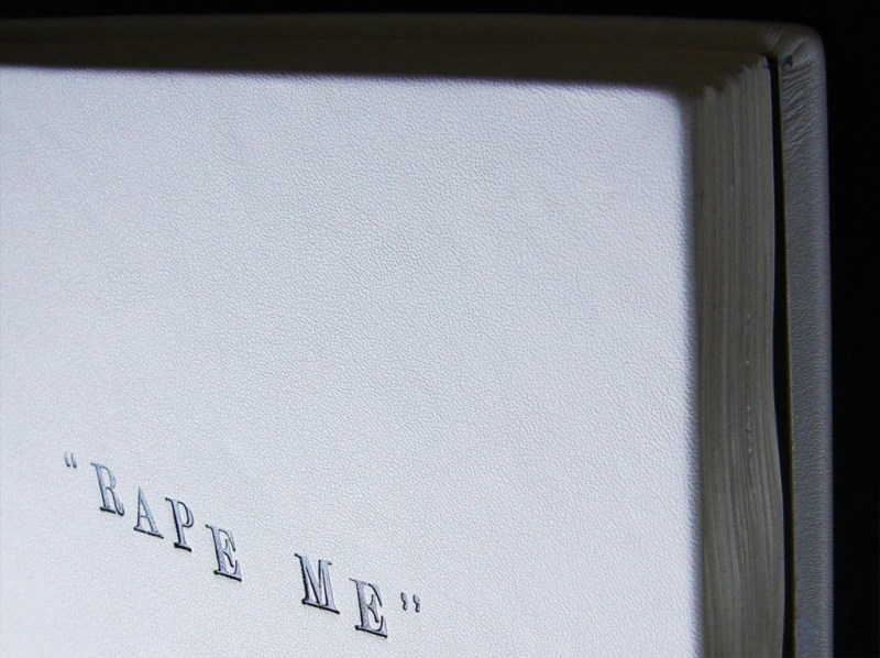 “Rape Me”, 2010, calf-leather hand-bound artist book: paint, pen, pencil, texta, crayon on 300 pages (drawn on the published diaries of Kurt Cobain), 28 x 22 x 6cm, unique