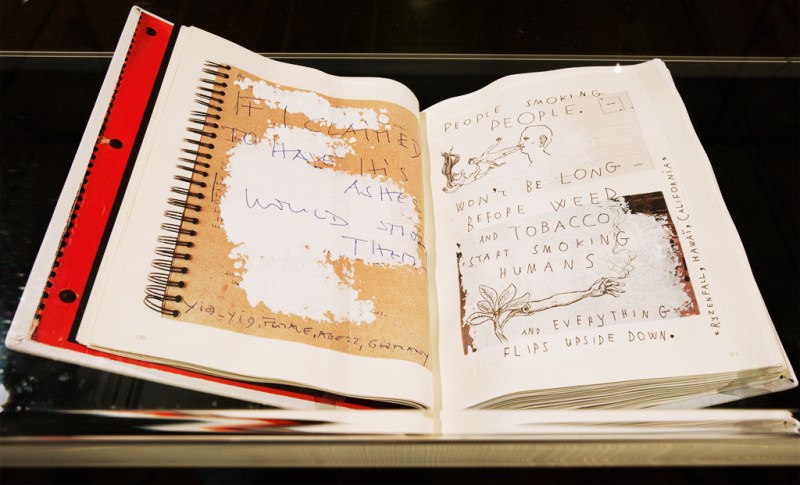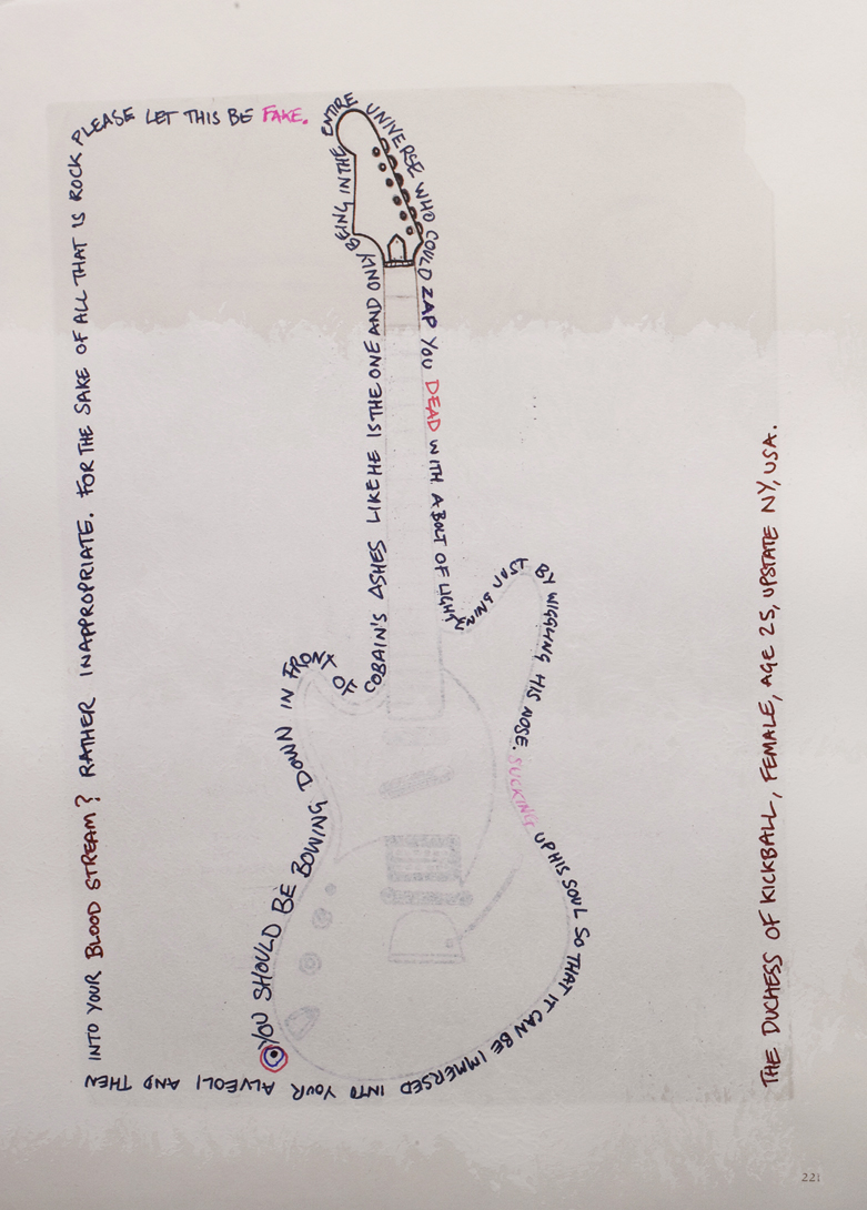 “Rape Me” (detail), 2010, calf-leather hand-bound artist book: paint, pen, pencil, texta, crayon on 300 pages (drawn on the published diaries of Kurt Cobain), 28 x 22 x 6cm, unique